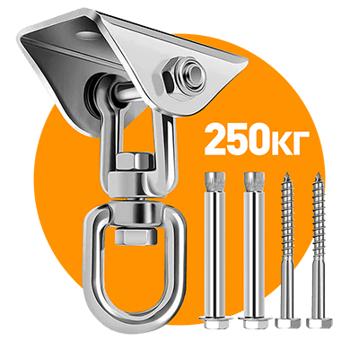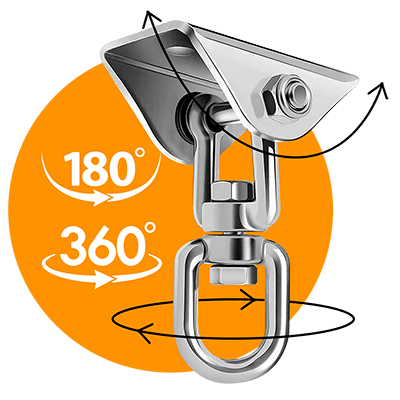 Поворотный механизм позволяет свободно вращаться на 360 без скручивания тросов и верёвок подвесного гамака. Болтовое соединение вертлюга и крепёжной скобы исключает риск деформации вращательного элемента от нагрузки при раскачивании и креплении блока под углом