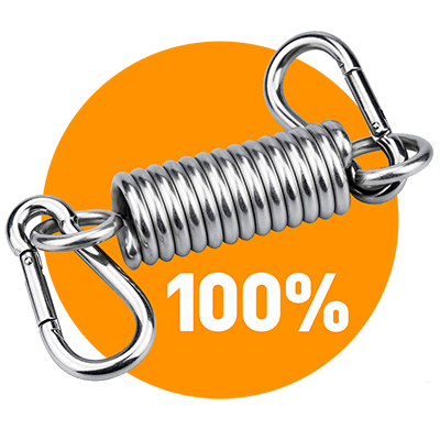 Удлинённая пружина из нержавеющей стали прошла тест на растяжение испытательной машиной Instron 8801, подтвердив свои упругие свойства при нагрузке 200кг. Сбалансированный ход растяжения пружины гарантирует комфортную работу креплений и смягчение нагрузки на ткани качели, продлевая срок их эксплуатации
