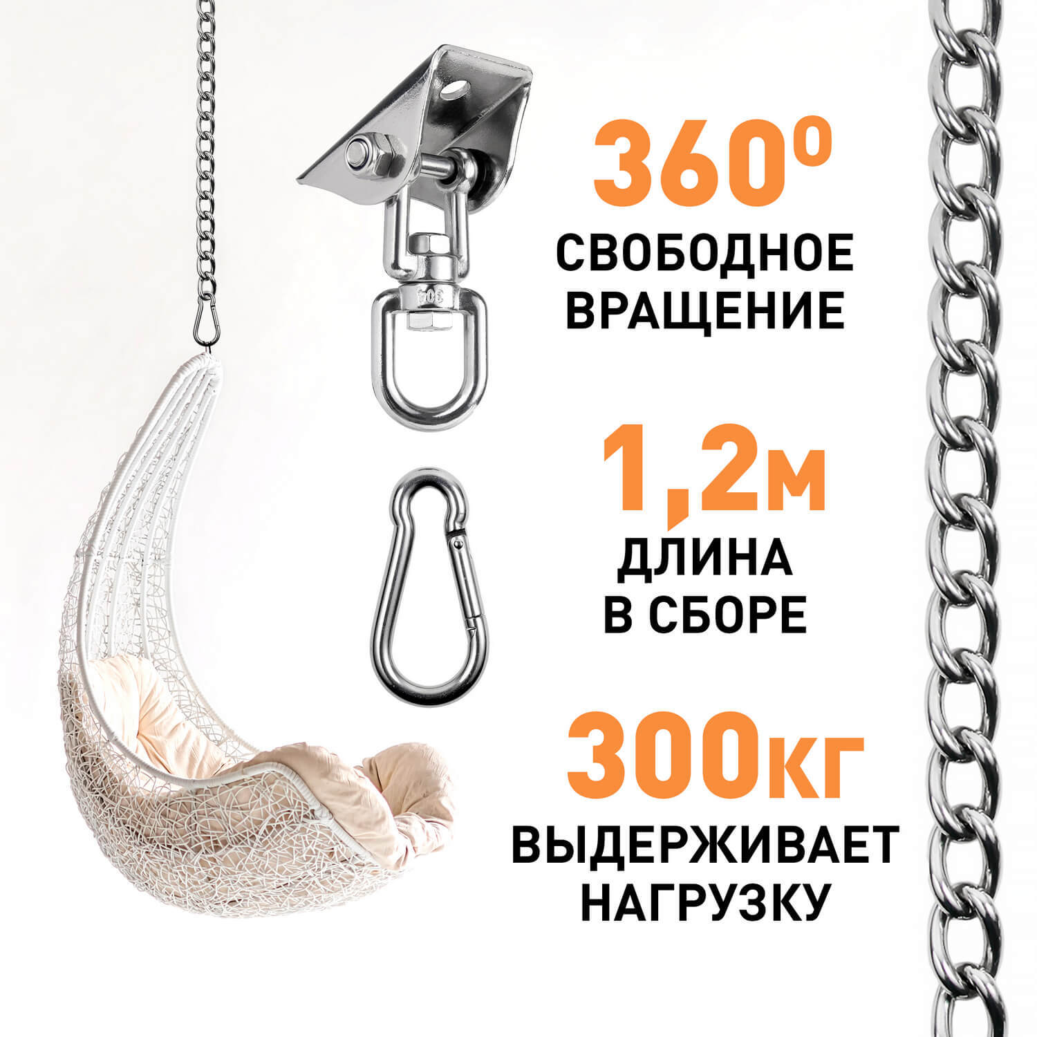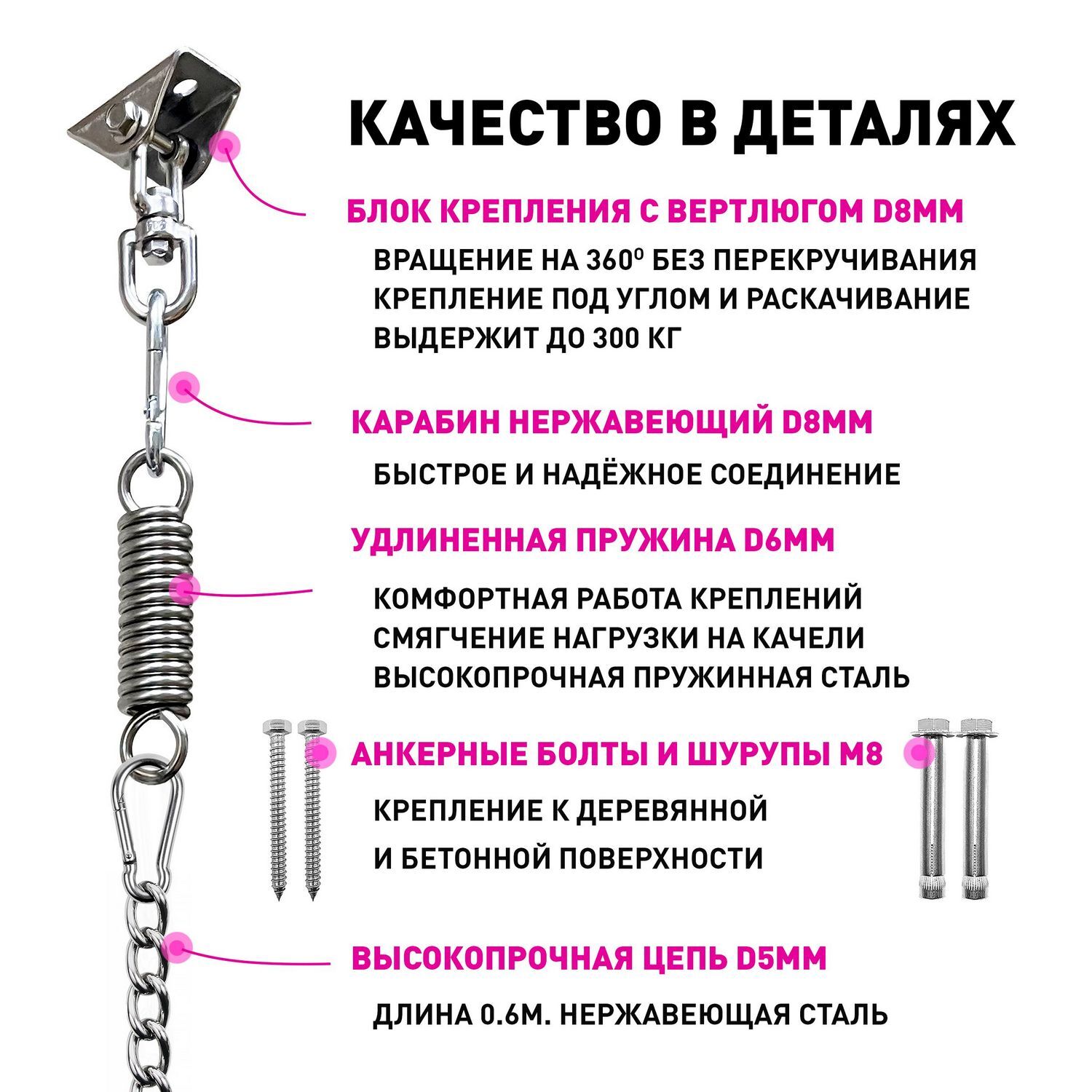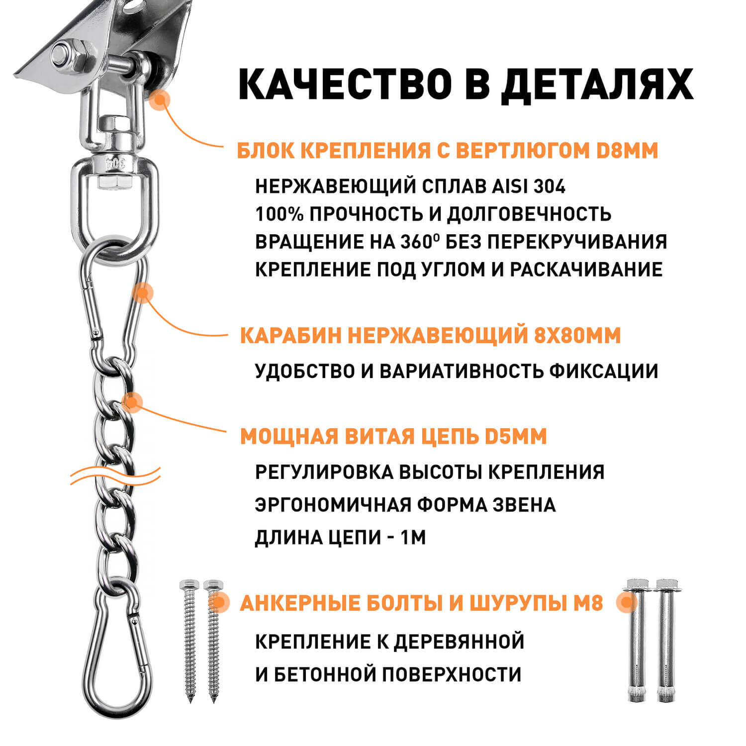 Крепежные элементы М8 в составе набора позволят закрепить подвес в любом месте, на улице или дома. Надёжный карабин и цепь для сборки различных комбинаций креплений помогут воплотить Ваши идеи в жизнь