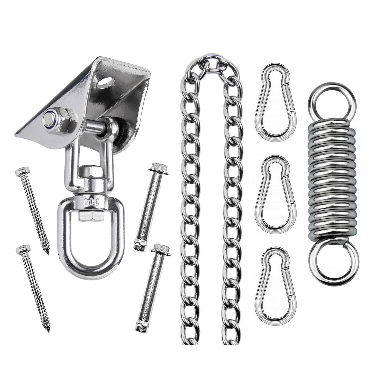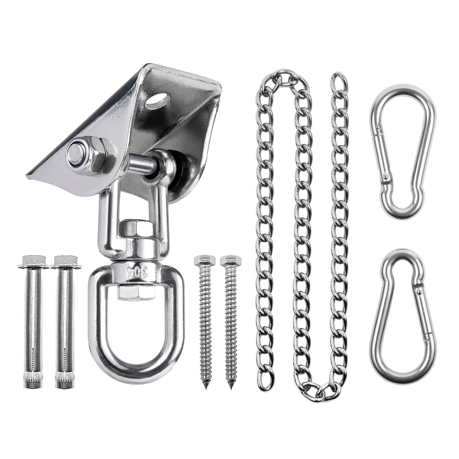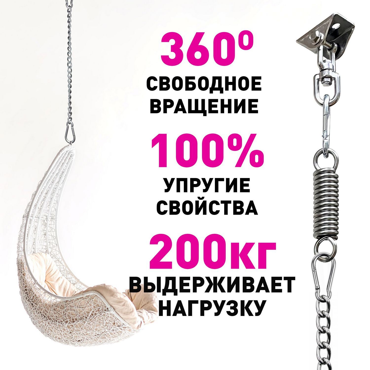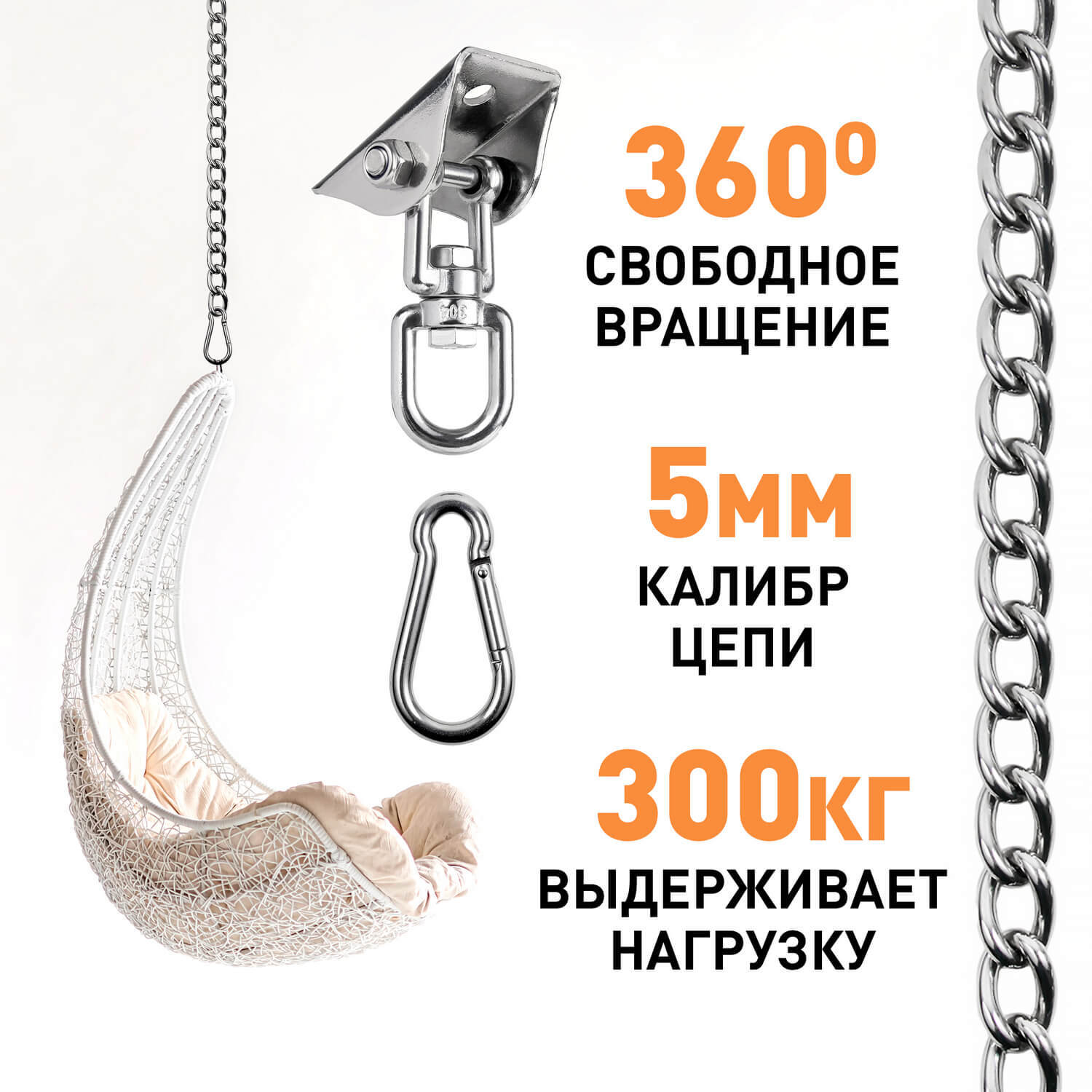 Крепежные элементы М8 в составе набора позволят закрепить подвес в любом месте, на улице или дома. Надёжный карабин и цепь для сборки различных комбинаций креплений помогут воплотить Ваши идеи в жизнь