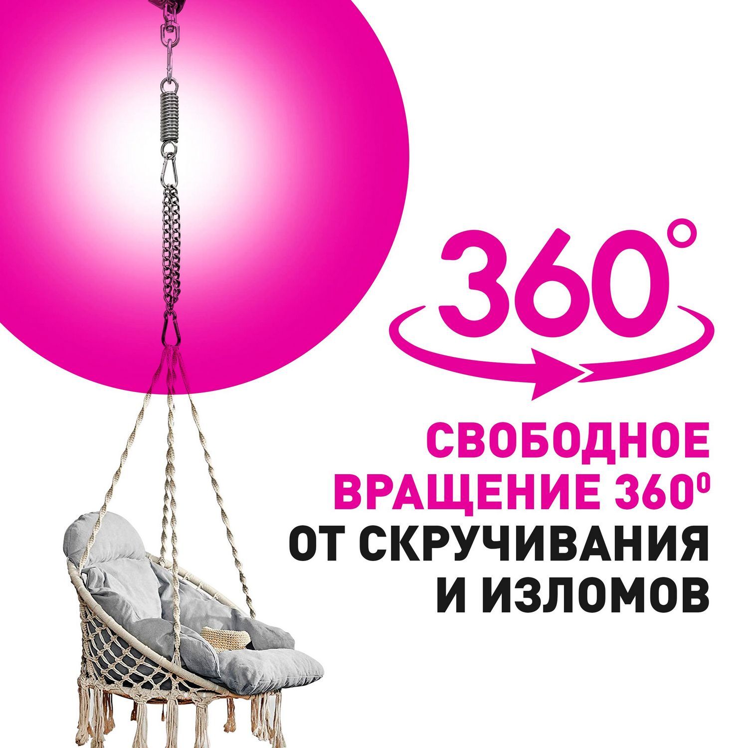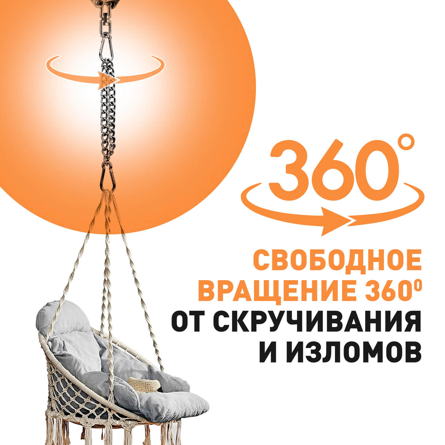 Блок крепления с поворотным механизмом позволит свободно и плавно вращаться вокруг своей оси на 360° без скручивания веревок и тросов.