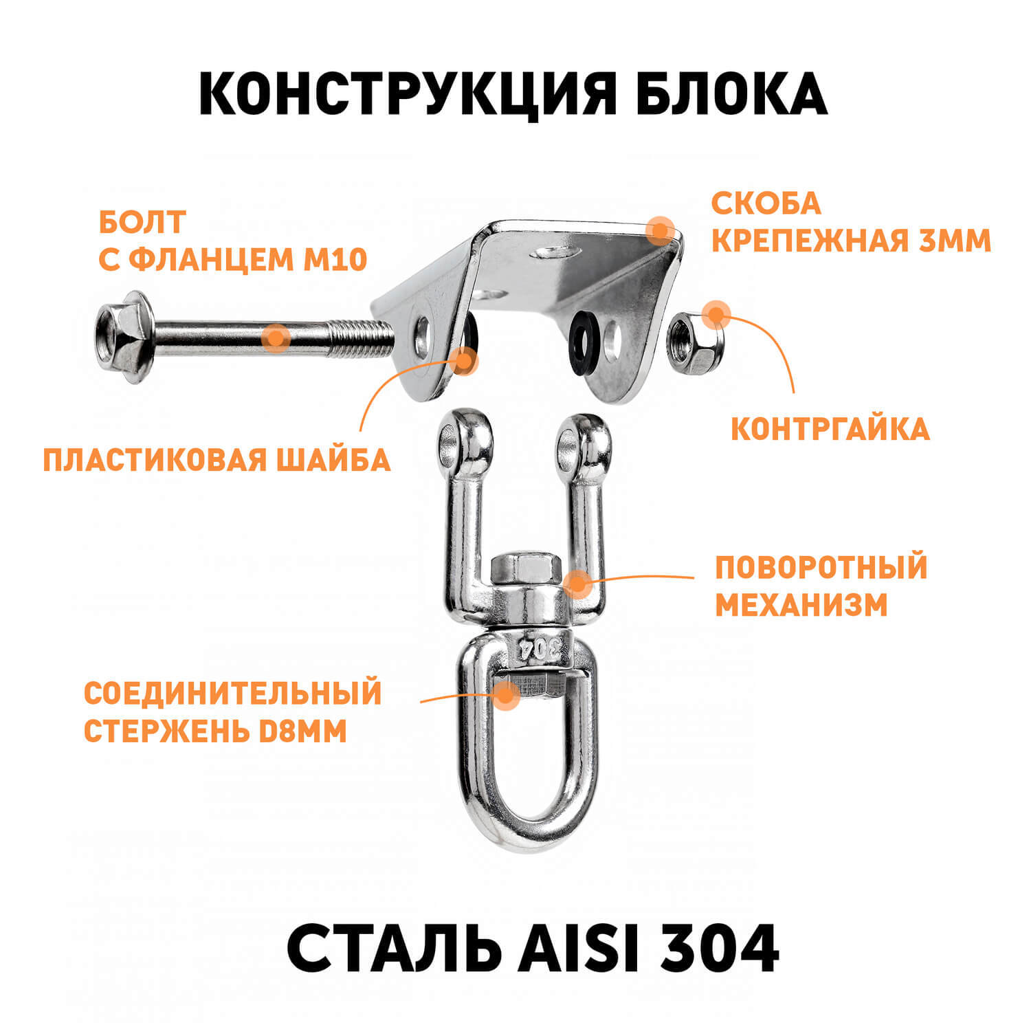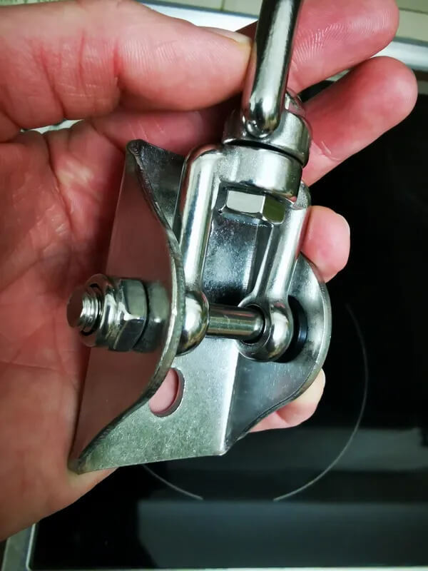 Поворотный механизм позволяет свободно вращаться на 360 без скручивания тросов и верёвок подвесного гамака. Болтовое соединение вертлюга и крепёжной скобы исключает риск деформации вращательного элемента от нагрузки при раскачивании и креплении блока под углом